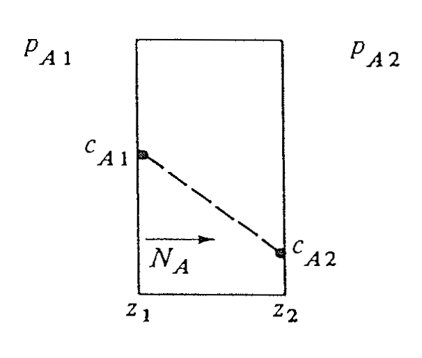 \[\begin{align} \boxed{ N_A = \frac{D_{AB} c_{A, v}}{z_2 - z_1} (x_{A1} - x_{A2}) } \end{align}\]We define \(c_{av}\) as the average total concentration in A+B (not A alone!):