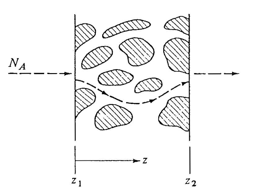 \[ N_A = \frac{\varepsilon}{\tau} \frac{D_{AB}\,(c_{A1} - c_{A2})} {(z_2 - z_1)} \]