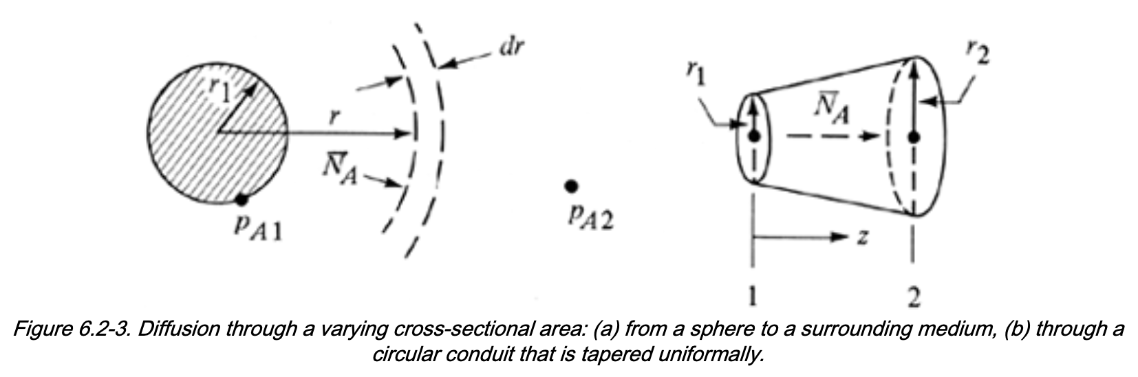 \[\begin{align} \boxed{ N_{A1} = \frac{D_{AB} p_T}{RT\,p_{Bm}} \left(p_{A1} - p_{A2}\right) } \end{align}\]Where \(N_{A1} = N_A(r=r_1)\). For liquid, another form is often used (considering \(p_{Bm}/p_T \approx 1\) and use \(p = cRT\))
