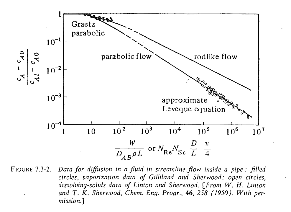 - parabolic flow (\(N_{Re} < 2100;\ \frac{W}{D_{AB}\rho L} > 400\))