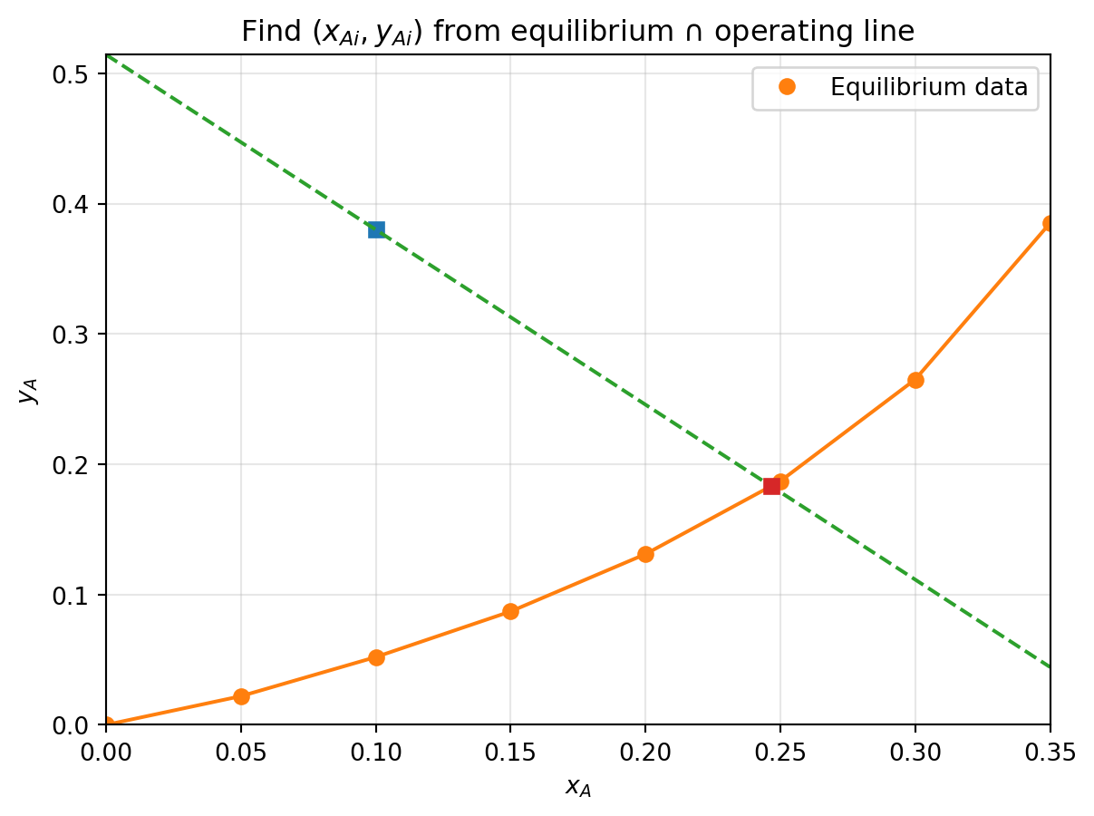 4) Read the intersect with equilibrium curve as $(x_{Ai}, y_{Ai})$