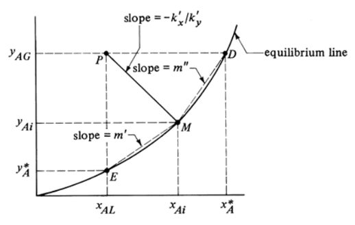 - Knowing \(k_x\) and \(k_y\) (film coefficients) allows us to calculate the interfacial concentration \((x_{Ai}, y_{Ai})\)