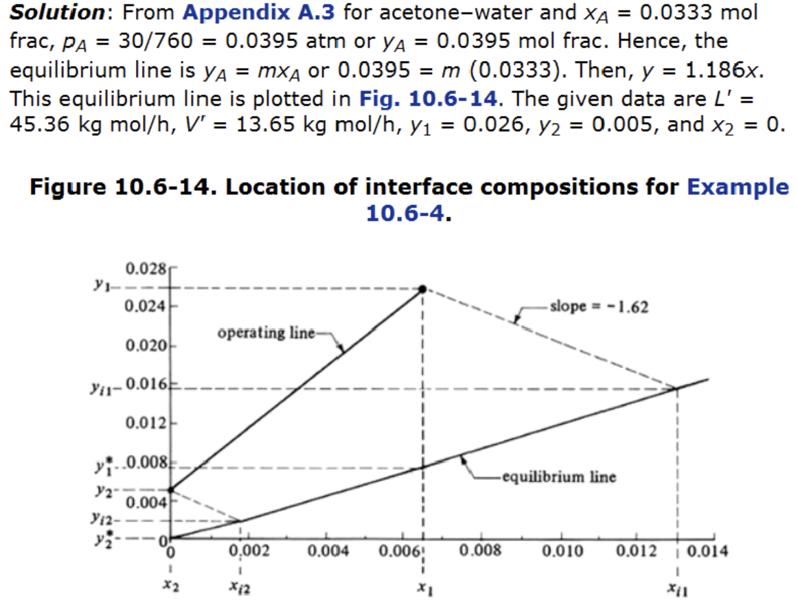 Similar example in Lecture 24, Acetone is being absorbed by water in a packed bed column having a cross sectional area of 0.186 m\(^2\) at 293 K and 1 atm. The inlet air contains 2.6 mol% acetone and outlet contains 0.5%. The gas flow is 13.65 kg mol inert air per hour. The pure water inlet flow is 45.36 kg mol water per hour. The coefficient \(k_y' a\) is estimated to be \(3.78 \times 10^{-2}\) kg mol/(s·m\(^3\)) and \(k_x' a\) is \(6.16 \times 10^{-2}\) kg mol/(s·m\(^3\)). The equilibrium line can be approximated by \(y = 1.186 x\).