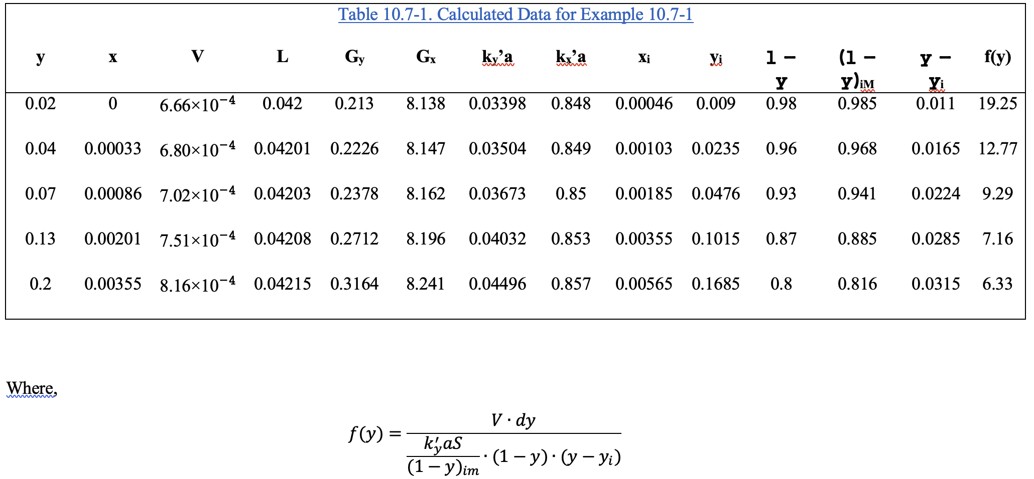 \[\begin{align} Z &= \int_{y_2}^{y_1} \frac{V dy}{\frac{k'_y a S}{(1 - y)_{im}} (1 - y)(y - y_i)} \\ &= \int_{y_2}^{y_1} f(y) dy \\ &= \sum_{j=0}^{n-1} [f(y_j) + f(y_{j + 1})] \frac{y_{j+1} - y_{j}}{2} \end{align}\]
