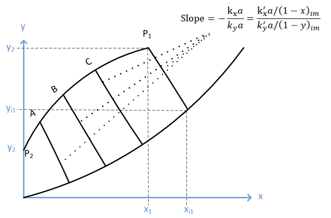 \[\begin{align} Z &= H_G N_G \\ &= H_G \frac{y_1 - y_2}{(y - y_i)_m} \end{align}\]- Total height \(Z\) is a stack of “transfer units” with height \(H_G\)