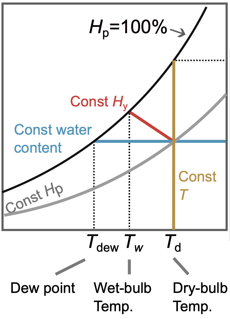 • The wet-bulb temperature \(T_w\) represents (when saturated) the maximum cooling achievable by evaporation, and it not confined to the wet-bulb setup.