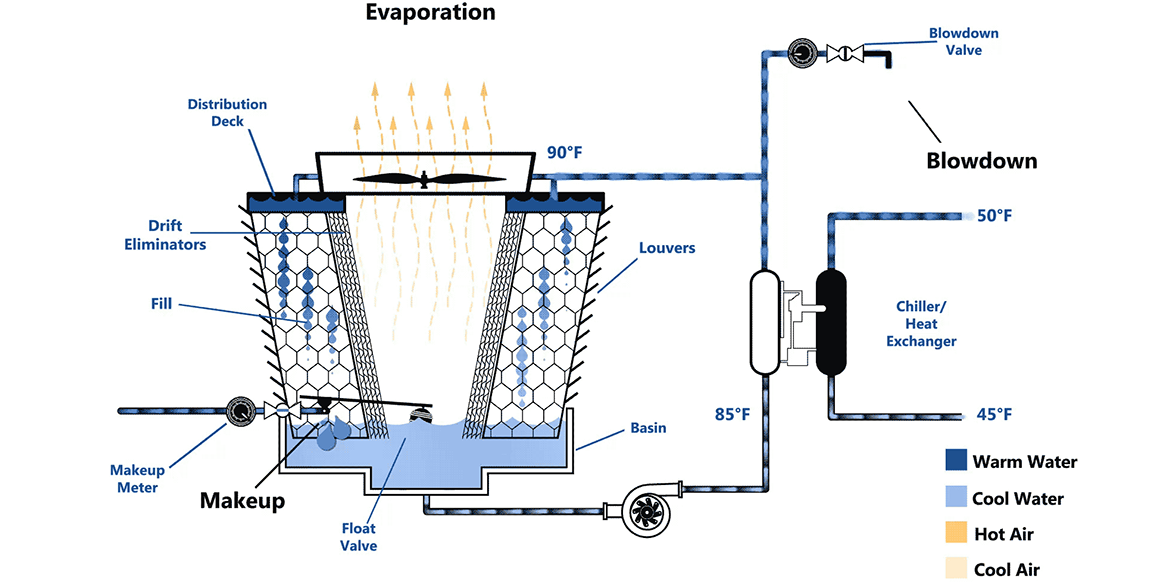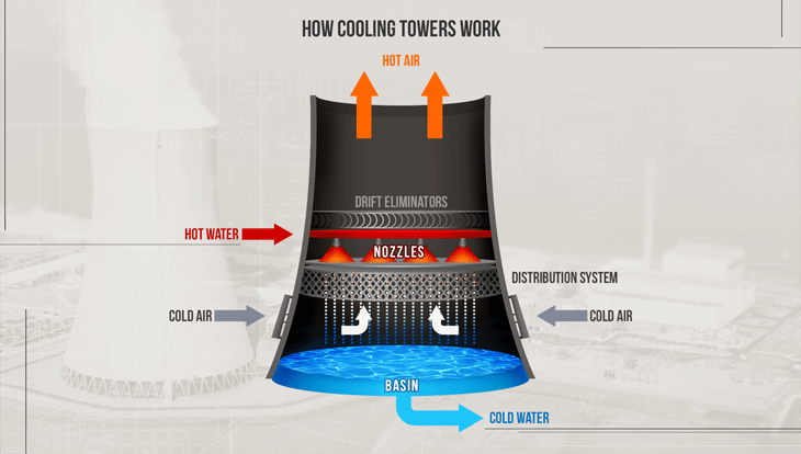 Chemical plants often uses water cooling tower for heat exchange. What is its mechanism?