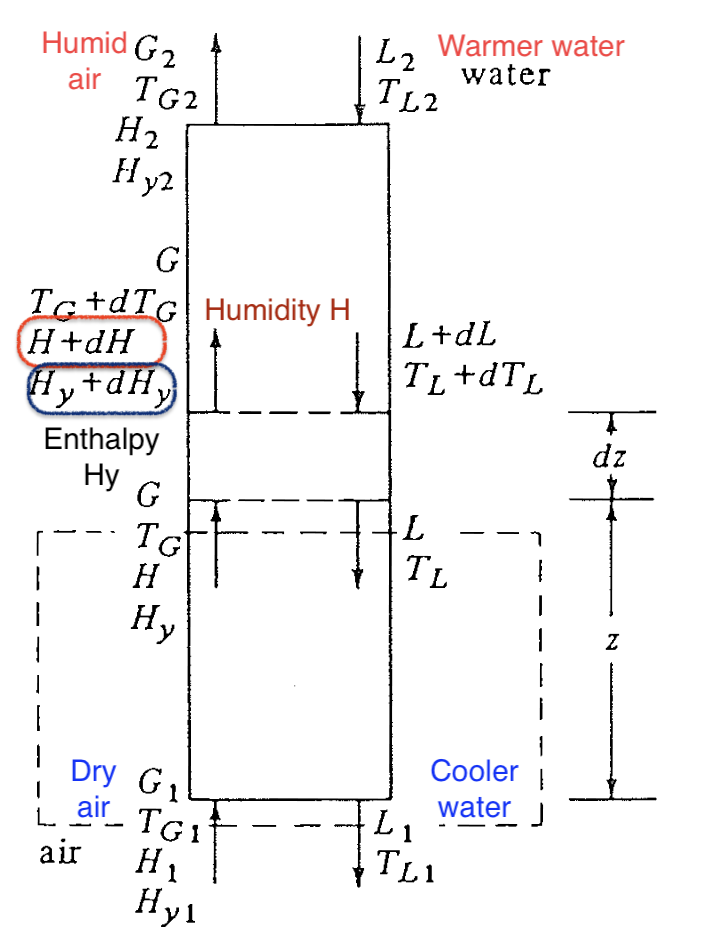 Recall in the case of absorption packed-bed tower, we solved a mass balance equation to describe operating line in the \(x-y\) diagram. The same applies to the cooling tower. An energy balance is used